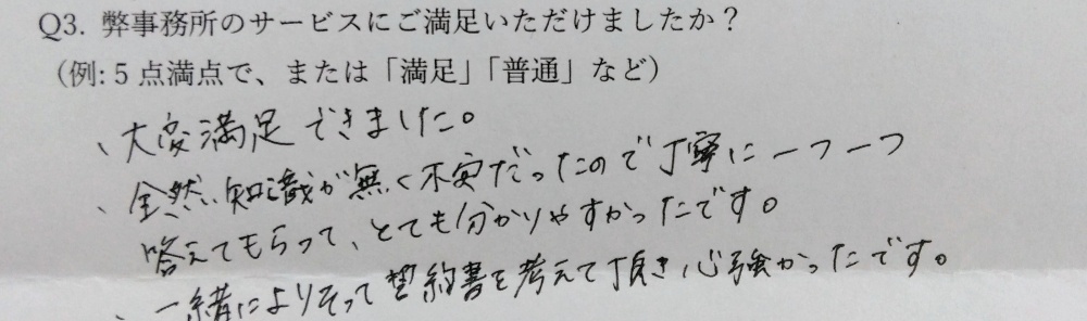 | ・大変満足できました。 ・全然知識がなく不安だったので丁寧に一つひとつ答えてもらって、とても分かりやすかったです。 ・一緒によりそって誓約書を考えて頂き心強かったです。 |
