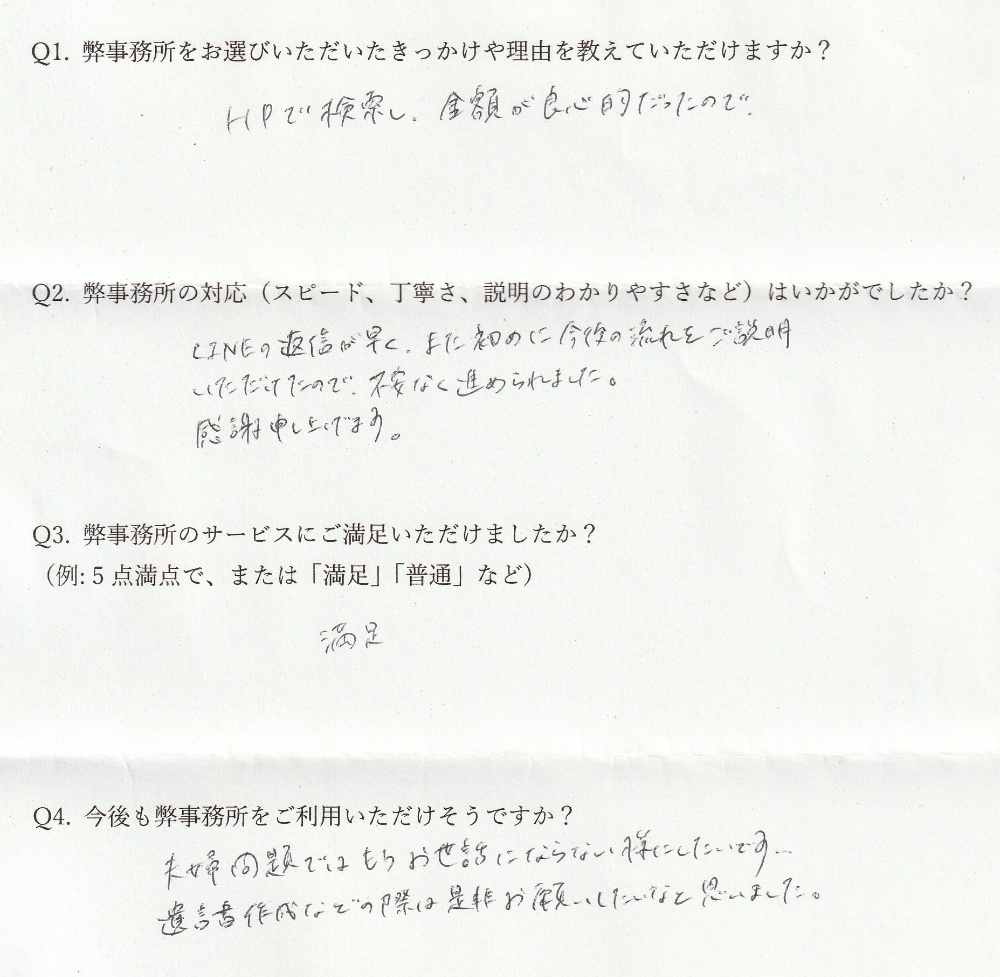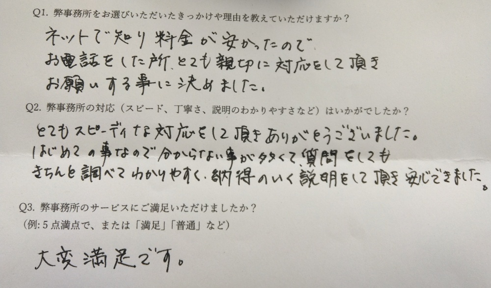 | インターネットを拝見し過去の依頼人の方々の感想等を見て、"安心してお願いできそう”だと思いました。作成料金もお安いと思いました。 |